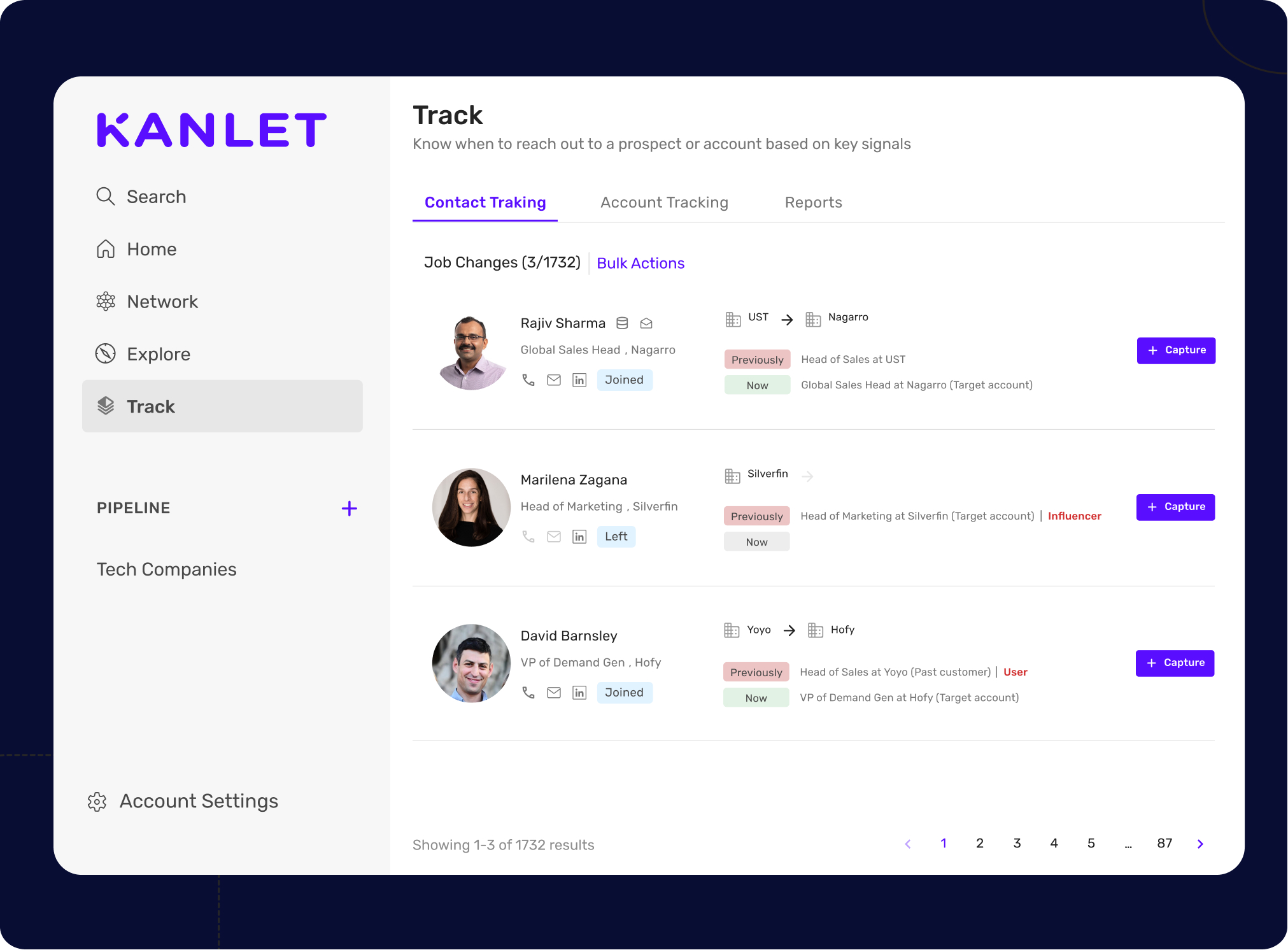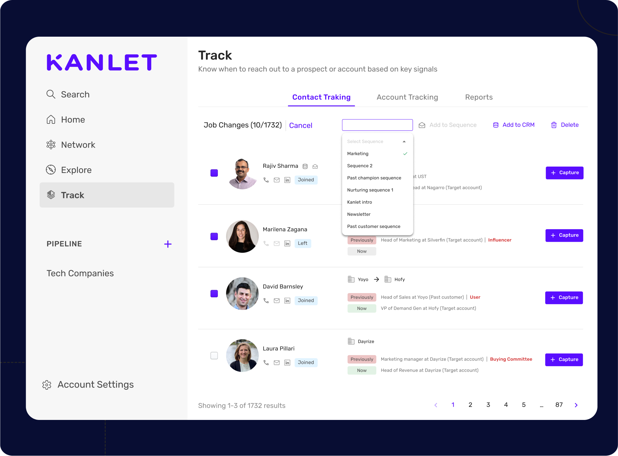 Track your key contacts and accounts for any job changes and surface them in your CRM as warm leads. Shorten your time to revenue.